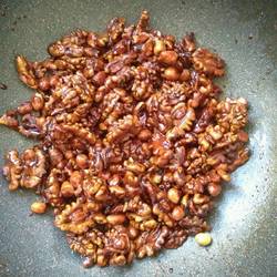 6. When the walnuts are almost cooked, sprinkle them with peanuts and continue to stir-fry until the peanuts are cooked and serve