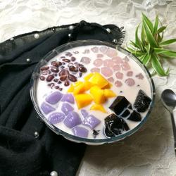 13.Put in grass jelly, taro balls or small yuanxiao, honey red beans, and cherry blossom pearls respectively.Then pour the milk tea base.You can also use milk base or coconut milk base.