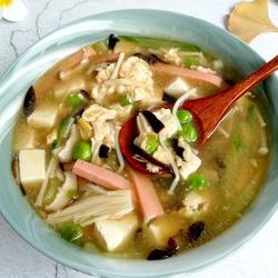 ②After boiling, add tofu, ham sausage, cucumber and pepper paste and cook for a minute or two.Pour in the beaten egg liquid, then pour in the prepared sauce and mix well.