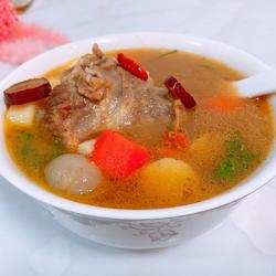 7. After simmering for 20 minutes , add the prepared carrots, yam, jujube and wolfberry in turn, continue to simmer for 10 minutes