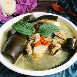 8.Add kelp, onion and ginger, mix well and bring to a boil, then turn to low heat, cover the pot, and simmer for about 1 hour