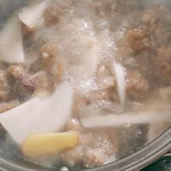 4.After the water in the pot is boiled ( The time for waiting for the water to boil is the time for the meat to marinate.) Add the meat.After the water boils, add a bowl of cold water and continue cooking.After the water boils for a few times, add the white radish and salt.