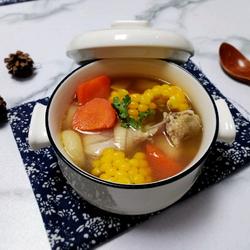 10.A delicious water chestnut, corn and chicken leg soup is ready.