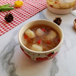 6.Add 600 ml of mineral water, cover the lid, and choose dessert soup for the health pot ( Or white fungus soup) function, one hour and 20 minutes.