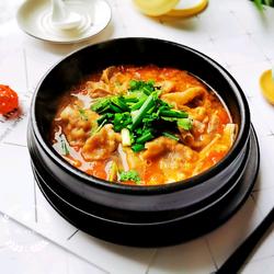 9.Put in the enoki mushrooms and add boiling water to cover the ingredients