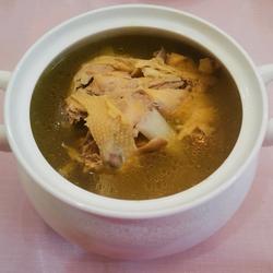 5.Put the water back into the pot and bring it to a boil, add onion, ginger, cooking wine, and 5-6 purple beans Put the blanched chicken into the Pi Feng bucket, cover the lid, and turn the knob to the soup setting