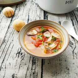 1. Prepare ingredients: wash, peel and dice tomatoes, wash and slice straw mushrooms and blanch them