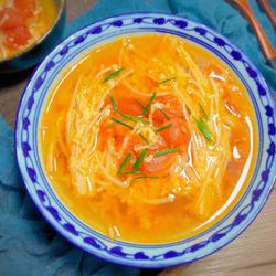 15.A nutritious and delicious enoki mushroom, tomato and egg soup is ready