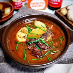 3. Heat oil in a pan, add beef bones and fry until fragrant, add bean paste and stir-fry until red oil appears, then stir-fry evenly