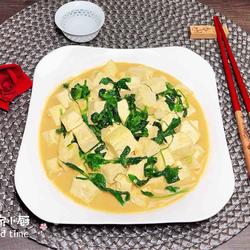 16. A plate of salty, fragrant and tender crab roe, pea sprouts and tofu soup is served., served with rice, the elderly and children love to eat it!