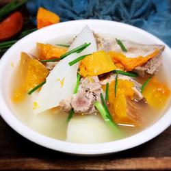 7.After half an hour, open the lid of the pot, add pumpkin, radish and salt, bring to a boil and continue cooking until the pumpkin is cooked and soft