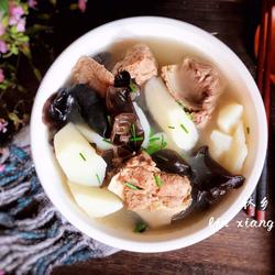 10.After 1 hour, open the lid, add yam and black fungus, bring to a boil, then turn to low heat and simmer for about 20 minutes