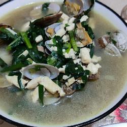 5.Add water, put tofu in the pot, add clams and leeks after 5 minutes, add Salt, light soy sauce, pepper, simmer over high heat for 5 minutes, remove from the pot