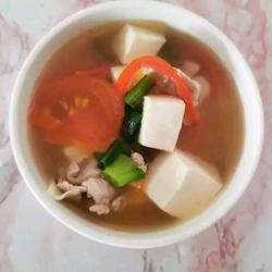 2. Cut the white tofu into the small pieces you want, wash the green onions and cut them into sections.Wash the tomatoes and slice them.Wash the lean meat and add a little salt to the slices.