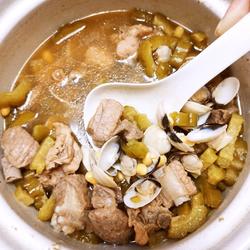 6.Put the soybeans, ribs, bitter gourd, pepper, and ginger slices into a pot with cold water, bring to a boil over high heat, then turn to low heat and simmer for 40 minutes