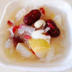 9. Boil until the soup is thick and the white fungus is boiled out, add the chopped pear, red dates and rock sugar and continue to cook for 20 minutes...