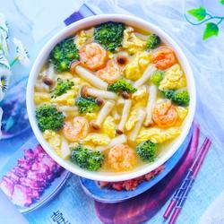Put oil in the pot, fry the eggs first and set aside.Add oil to another pot, add shrimps and fry until they turn red, then add white jade mushrooms and stir-fry out the water, add a large bowl of water and bring to a boil.