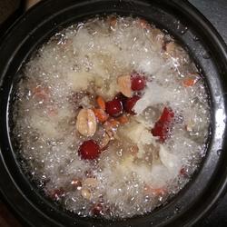 8.Put it in another pot Pour 3-4 bowls of water (depending on how many people drink it), boil it, add white fungus, cook for 10 minutes, add red dates, cook for another 20 minutes, add wolfberry and rock sugar, and simmer over low heat.