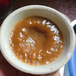 3. Then remove the water and pour it While stirring, here I use boiled brown sugar water.Stir into raw and cooked pulp
