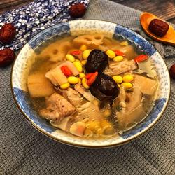 7.Put the lotus root, soybeans, red dates, wolfberry and ginger slices into the pot.