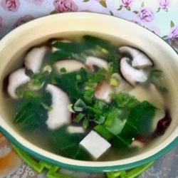 5.Put the blanched tofu cubes and mushrooms into a pot, add a large bowl of water, salt and chicken essence and bring to a boil