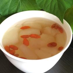 4. After the high heat comes to a boil, turn to medium to low heat and continue to simmer for about 20 minutes.When the pear pieces become transparent, they are ready.Pour in the wolfberry, bring to a boil over high heat, and then turn off the heat;