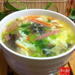7. Thicken with water starch, pour egg liquid and add coriander, sesame oil and white pepper.