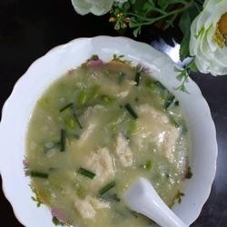 7. Pour the prepared batter into the pot to thicken and bring to a boil.Finally add the leeks and add appropriate amount of salt and chicken essence