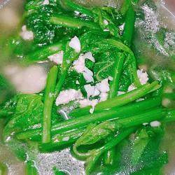 6.Put oil in the pot, heat the oil and stir-fry the lean meat, add water, boil the pumpkin seedlings, and cook until five Minutes, add garlic, salt and chicken essence, season to taste and serve.