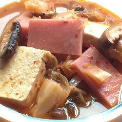 1. Heat oil in a pot for 7.8 minutes, add garlic kimchi and sauté until fragrant.Add appropriate amount of water and bring to boil.Add the mushrooms