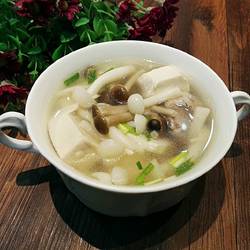 8.Add the double mushrooms and tofu to the pot and cook for 5 minutes.