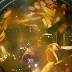 4.Step 4: Add cold water to the casserole.Cordyceps flowers, morels, yams, kelp knots, shiitake mushrooms, seafood mushrooms, peanuts.Add salt and white pepper.Bring to a boil over high heat, then simmer for 30 minutes, then add chicken essence and simmer for ten minutes before eating!