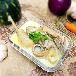 4.Put the pork belly chicken into the pressure cooker and pour in the milk.
