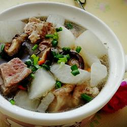 6.Put the mushrooms Chop it finely, put it into a soup pot with the white radish, ginger and ribs, add water to cover the radish and ribs, and simmer for two hours