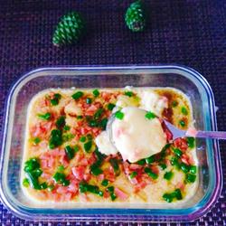 5. After steaming for eight minutes, add the remaining ham, sprinkle with chopped green onion and steam for about ten minutes Turn off the heat.