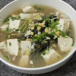 5.Put the corn and tofu in and simmer for 5 minutes.Add cooking wine, soy sauce, and sugar and cook for about two minutes.Add an appropriate amount of salt and chicken essence.
