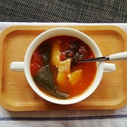 4. After frying and softening, add a little soy sauce and pour in the stock, or you can use hot water without the stock., add a green onion, add kelp first after the water boils, and cook like this for ten minutes.