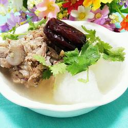 4. Put water in a casserole and bring to a boil.Add large bones, green onions, ginger, dates and wolfberries, and simmer over low heat for 1-2 hours.