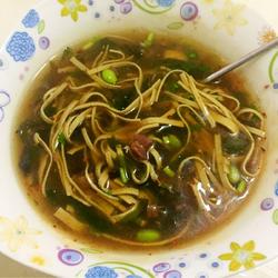 3.After two minutes, add the bean skin, kelp and fungus and continue to cook for one minute, add some Dark soy sauce for coloring.