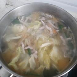 3.Put a little oil in the pot and stir-fry the shredded pork., when the mustard shreds are cut off, stir-fry for two times, put in three bowls of water, bring to a boil, add salt, chicken powder, chopped green onion, and you are ready to serve!