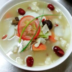 4.Wash the pot, add chicken soup, if there is no chicken soup, add purified water, and bring to a boil Add the raw materials, add ginger slices, green onion segments, shiitake mushrooms, wolfberry, and red dates, simmer over low heat for 15 minutes,