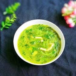 Marinate the shredded pork for fifteen minutes, stir-fry the spinach until it changes color slightly, bring hot water to a boil, add salt, chicken essence, and shredded pork and mix well.
