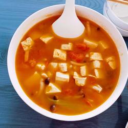 7. Stir-fry until it changes color, add the tomatoes, stir-fry the tomato soup, add water, then add tofu and seafood mushrooms, simmer over high heat for 10 minutes..