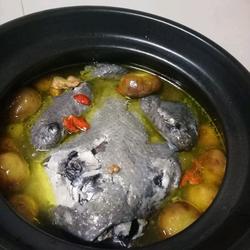 1. Boil the water and blanch the whole black-bone chicken in a pot to remove the blood and fishy smell To taste, add water to the casserole until just enough to cover the black-bone chicken, submerge the black-bone chicken under cold water, and add ginger slices and peppercorns.