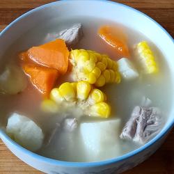 5. Stew the pork chop, add corn, carrots, and yams and continue stewing