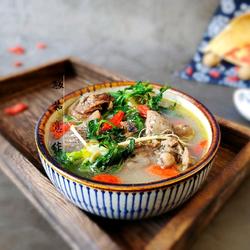 13. At this time, just put the blanched shepherd's purse into the chicken soup.