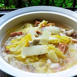 4.Put two to three bowls of cold water into the pot with the luncheon meat and bring to a boil.Add the cabbage and cook until the cabbage becomes soft