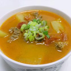 4. Add a small amount of chicken essence (you can also skip it) and serve.Sprinkle with chopped green onion.A bowl of tomato, potato and beef brisket soup with delicious color and flavor is ready