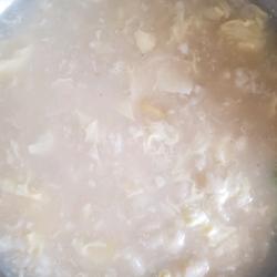 4. After the eggs are in the pot for one minute, pour in the mixed flour lumps, and keep stirring in one direction to prevent the flour from sticking.Together