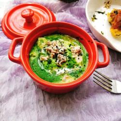 5.A layer of tofu and a layer of lean meat topped with mixed egg and spinach juice